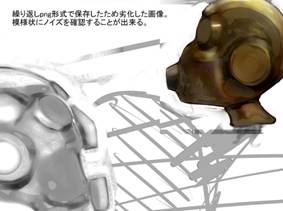 キャラクター造形に決定的なミス。複数のカットで登場するキャラクターの造形はデザインを計画して設計した。一方、一回しかでないキャラクターは背景作業と同時に作りあげなければならなかったのだがそれが思わぬ障害に。とりあえずイヌの造形にとりかかり、エアブラシ・黒で形を作ってみるが気に入らない。周囲との調和がとれていないのか。制作工程がこのように長期にわたる場合描画スタイルも変化するためこのような納得いかない結果になった。かつて良しとしていた描写法が今では納得いかない、というものである。とりあえずある程度はあきらめて、グレースケールをそのままに納得できる彩色を考えなければならない。作業キャンバスとして使っていたPNG形式画像が劣化した。作業中のキャンバスをPNG形式で保存していたら、劣化してノイズが入るようになってしまった。PNG形式では透明情報も保存できるので簡単な線画や習作を保存する形式として使用していたのだが、塗りでもPNG形式のまま繰り返し保存していたためこのような結果になった。とりあえず水彩ブラシと、ぼかし系のブラシでごまかす。幸いにもノイズが酷いところはロボットのボディ部分だったので表面のテクスチャとしてごまかすことにする。劣化するということは知っていたが実際にこのようなデーターの劣化は初めてだったので、いい経験になった。今後はSAIキャンバス形式で作業を行う。