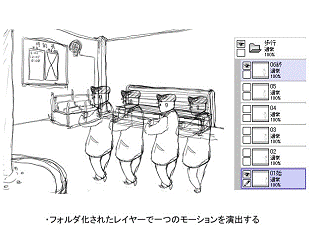 人体を回転させたり、歩かせたりといったモーションの描写は難しい。そこで簡単な動作では画像変形ツールを使った方法が効果的だが、一つの動作を作り終えたらそのレイヤーをフォルダー化し、そのフォルダーを人形のように構成レイヤーを切り替えて画面をつくると管理がしやすい。フォルダー単位で移動させ、構成レイヤーを切り替えてモーションを撮影した後、動作終了時のレイヤーと動作開始時のレイヤーの位置を合わせれば歩くシーンの作画は最低限で済む。またキャラクターのモーションを確認する際、WMMのプレビュー画面では映像の描画が正確でない場合があるので、実際にWMV形式に出力してカットごとの動画を確認しなければならない。また、カットの始まりと終わりの止めはタイムライン上で調整することによってペイントソフトで出力する手間を省く。