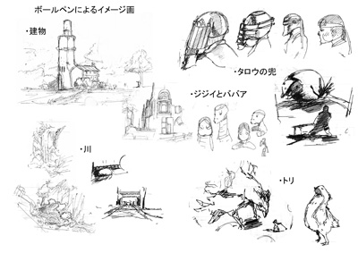 キャラクターのアイデアが問うとしてでない。まず背景を出してから様子をみるか。背景はその作品の世界観を象徴する。桃太郎という昔話の世界をそのまま導入しては詰まらないという当初のコンセプトから、人工構造体の群れを想定しているがそれはそれで安易な設定かもしれない。しかし昔話の里山的原風景を廃都市に置き換えることで、おのずとキャラクター造形の方向性も定まってくるのではないだろうか。ストーリーが先行して画面を作るのでなく、とりあえずはストーリーを切り離して画面を作ることを考えよう。