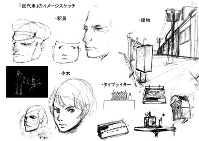 ほとんどのシーンが背景を真っ暗な闇にし、そのなかを白の手描き線で描写しておぼろげな輪郭や灯りの瞬きを表している。そして、ところどころでキャラクターが吐き出す白い息によって寒い深夜という空間を演出した。またそれぞれのシーンでキャラクターの姿や顔の描写が異なるのは、同じ人間の顔でも時と場によってまったく別の人間のように見えるという考えがあったからだ。駅の建物や列車は現実感に乏しいが、全体としてレトロなデザインで統一した。自分のなかにある、寂れた駅というイメージの断片を集めて組み合わせた造形となっている。