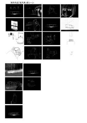 先ほどの制作方針を踏まえカット〇三までを制作し、作業手順のテンプレート化が一応完成する。作業キャンバスサイズはデフォルトの幅六四〇pixel高さ四八〇pixel解像度七十二dpiのVGAサイズ。作業キャンバスとしては小さいが、一本一本の線がストロークに合わせて綺麗に引かれる。手描きによる線を演出するには適度なサイズのキャンバスである。ブラシは主に鉛筆ブラシでサイズは〇・七から三と細めで設定する。光のぼかしは筆ブラシとエアブラシで微妙に調整していく。また彩色はせず、白と黒の二色で表現しキャンバスを黒で塗りつぶしそこを白の線で抜いていくことで夜間の淡い光を表現していく。それぞれのカットの画像はフォルダーで管理する。以上のような作業上のテンプレートを基準として作画していく。