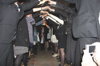 | 2・3年生がつくる人のアーケードの中、4年生退場。ありがとう! |