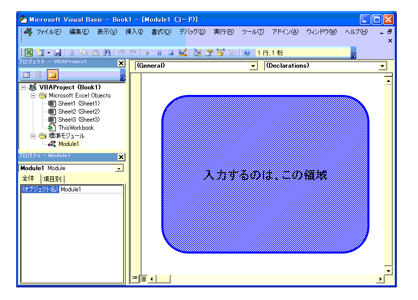 プルダウンメニューの「挿入」から「標準モジュール」を選択します。するとタイトルバーの記述が「Microsoft Visual Basic -Book1-[Module1(コード)]」となります。今追加されたウインドウ内に入力していきます。