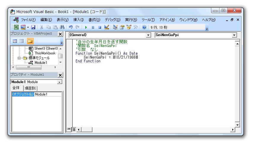 標準モジュール内に『'自分の名前を返す関数』と入力してみます。鍵カッコは入力しないでください。「'」は「Shift」+「7'や」で入力できます。